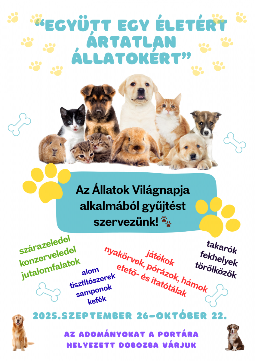 Iskolánk az Állatok Világnapja alkalmából adománygyűjtést szervez, hogy közösen támogassuk a rászoruló négylábúakat.