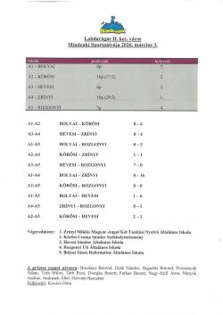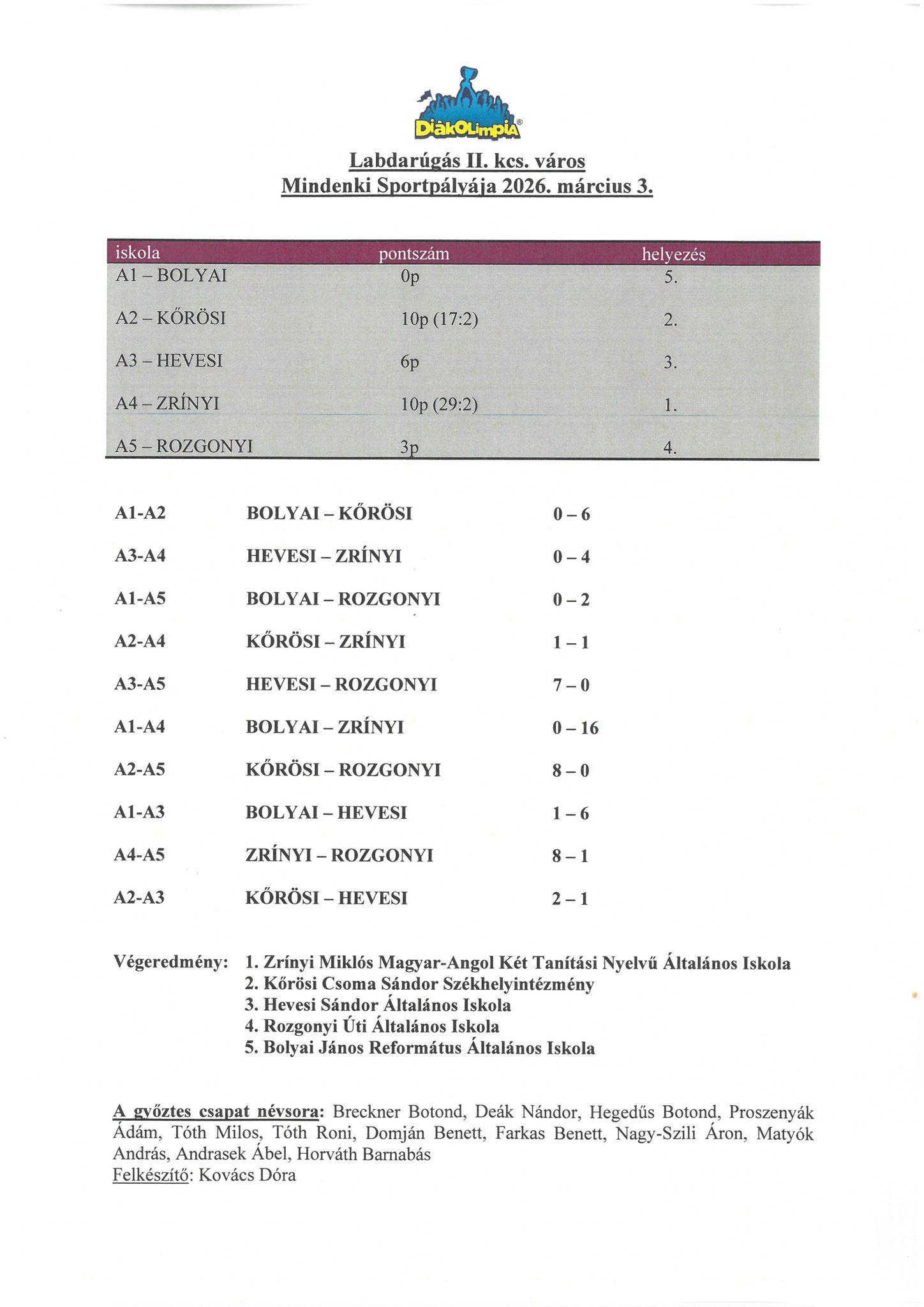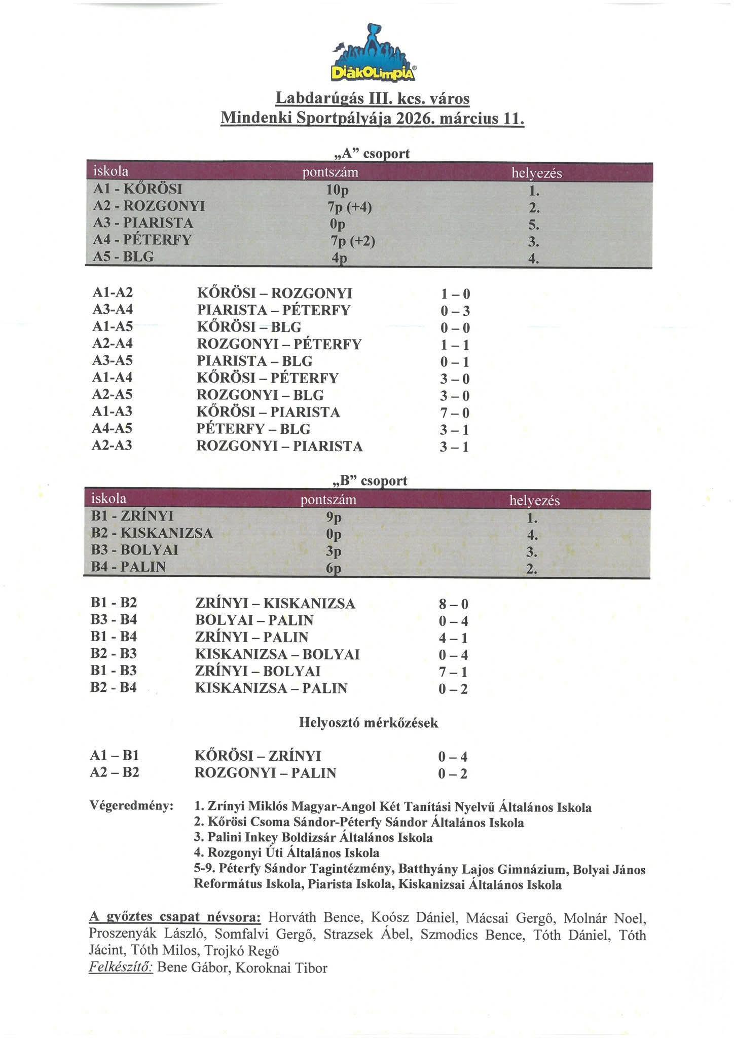 A főként 3 – 4. osztályosokból álló együttesünk az 5 csapatos mezőnyben 1 győzelemmel és 3 verseséggel 4. helyen végzett a körmérkőzések során. Nagyon lelkesen játszottak a gyerekek, de az ellenfelek több felkészült focista palántával rendelkeztek, míg a mi csapatunk inkább lelkes amatőrökből és feltörekvő másodikasokból állt.