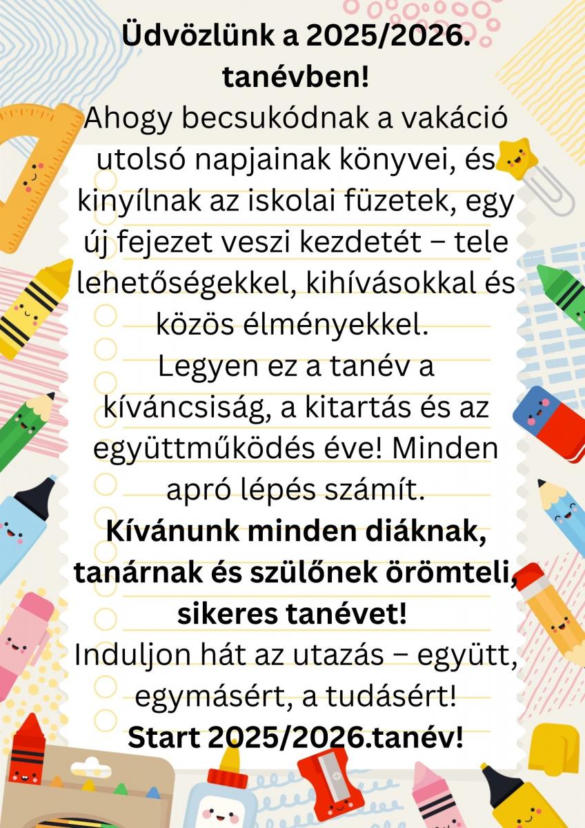 Iskolai események 2025. augusztus 19., kedd Javítóvizsga 2025. belépés 2025. augusztus 17., vasárnap Tanévkezdésre - 2025/2026. belépés 2025. június 20., péntek Vakáció 2025. belépés 2025. június 20., péntek Tanévzáró ünnepség 2025. A tanévzáró ünnepség és a bizonyítványok kiosztása 2025. június 24. (kedden) 17:30 órakor kezdődik. Helyszín: az iskola udvara. Gyülekező az osztálytermekben, ahonnan az osztályfőnök vezetésével együtt vonulnak le az osztályok. Kérjük a diákságot, hogy az alkalomhoz illő, ünnepi öltözetben jelenjen meg! belépés 2025. június 19., csütörtök Gyermeknap a felső tagozaton Jókedvűen telt a felsősöknek a tanév utolsó hetének keddje. Tanítás helyett a szórakozásé és a játéké volt a főszerep. Az 5.a és 5.b osztályos lányok színvonalas tánca nyitotta a programok sorát. Majd - legalábbis egy bemutató erejéig - a madarak vették át az uralmat az udvaron. A családsegítők minden osztályban csapatépítő játékkal gondoskodtak a jó hangulatról. Folytatásért kattints! belépés 2025. június 12., csütörtök Három diák-alpolgármester segíti a jövőben Herczeg Valter diák polgármester munkáját Nagykanizsán Az egyik Takács Kamilla 8.b osztályos tanulónk. A kép forrása: https://kanizsamediahaz.hu/hir/202506/harom-diak-alpolgarmester-segiti-a-jovoben-herczeg-valter-munkajat belépés 2025. június 11., szerda Szabó Szilárd munkatársunk elismerése Szabó Szilárd munkatársunknak a 2024. évben nyújtott kiemelkedő sportteljesítményéért Nagykanizsa Megyei Jogú Város Önkormányzata "A Sport Támogatásáért" elimerő oklevelet adományozott. Szeretettel gratulálunk hozzá! belépés 2025. június 07., szombat Honvédelmi tábor 2025. Több, mint egy tábor! Kaland, kapcsolat,kihívás! belépés 2025. június 02., hétfő Jelenlévő múlt az oktatásban,avagy egy cseppnyi Zala a Rozgonyi Iskolában belépés 2025. május 28., szerda Kiállítás a Galériában 2025. május 27-én nyílt meg a második szinten, a Galériában Szabó Zsolt természetfotóiból készült kiállítás. Szívesen látjuk az érdeklődőket a képek megtekintéséhez! belépés 2025. május 08., csütörtök Kiállítás a galériában A kiállítás megekinthető az iskola galériájában. belépés 2025. május 08., csütörtök Művészeti és hangszerbemutatók Nagykanizsán - Farkas Ferenc Zene- és Aranymetszés AMI szervezésében A programon készített fényképekkel frissítve! belépés 2025. április 27., vasárnap Papírgyűjtés - megváltozott időpontban Tájékoztatjuk a tisztelt Szülőket, hogy az iskolai papírgyűjtés időpontja megváltozott: 2025. május 6-7. az új időpont. Kérem, tekintse meg a csatolmányban található plakátunkat is! belépés 2025. április 19., szombat Húsvét 2025. belépés 2025. április 16., szerda Segítő angyalok a Rozgonyi Suliban Egy segítő kéz csodákra képes! Együtt építünk hidakat és oldunk meg problémákat, hiszen az összefogás a siker igazi kulcsa. Minden apró gesztus számít, és minden tett hatással lehet valaki életére. belépés 2025. április 15., kedd 2025. április 11. - a költészet napja a Rozgonyiban „Nem szükséges, hogy én írjak verset, de úgy látszik, szükséges, hogy vers irassék, különben meggörbülne a világ gyémánttengelye." József Attila Április 11-e József Attila születésnapja és egyben a magyar költészet napja is. Ebből az alkalomból az 5.b és a 6.a osztály tanulóival a Halis István Városi Könyvtárban is ünnepeltünk. A „Játék a versekkel" foglalkozáson a gyerekek kortárs magyar szerzők verseit dolgozták fel, értelmezték újra, sőt, ők maguk is részesei lehettek az alkotói folyamatnak. A magyar költészet kincsestára kifogyhatatlan, köszönjük, hogy mi is kaphattunk útravalóul belőle. Képgaléria megtekintéséhez kattintson a hírre! belépés 2025. április 14., hétfő Rendhagyó ének-zene óra a Rozgonyiban " ... Sokszor egyetlen élmény egész életére megnyitja a fiatal lelket a zenének. Ezt az élményt nem lehet a véletlenre bízni: ezt megszerezni az iskola kötelessége" Kodály Zoltán belépés 2025. április 01., kedd „Jazz a lelke mindennek" 2025. április 1-jén (kedden) iskolánk felső tagozatos tanulói a Filharmónia Magyarország 3. hangversenyén vettek részt. A Jazzformers nevű együttes adott egy fergeteges koncertet, amelynek során játékosan meséltek a jazz történetéről, és komoly szerep jutott a hangszerek bemutatásának is. Képgaléria a csatolmányban! belépés 2025. március 23., vasárnap Honvédelmi szakkör Hívunk! Gyere te is! Bármikor becsatlakozhatsz! belépés 2025. március 14., péntek Március 15. - iskolai ünnepség 2025. március 14-én megtartottuk az iskolánkban az 1848/49. forradalomra történő megemlékezést. Az eseményhez kapcsolódó ünnepi műsort az idei évben a 7. évfolyamosok adták. Felemelő érzés volt résztvenni az eseményen. Gratulálunk a felkészítő pedagógusoknak és a szereplőknek! A kapcsolódó fényképeket és a vidófilm anyagát iskolánk dolgozója, Kómár Szabina bocsátotta a rendelkezésünkre. Ezen az rendezvényen tudtuk először kipróbálni a háttér drapériát is, amely szülői felajánlás segítségével készült el. Nagyon szépre sikeredett ez is! Ezúton is köszönjük szépen! (Képek a csatolányban!) belépés