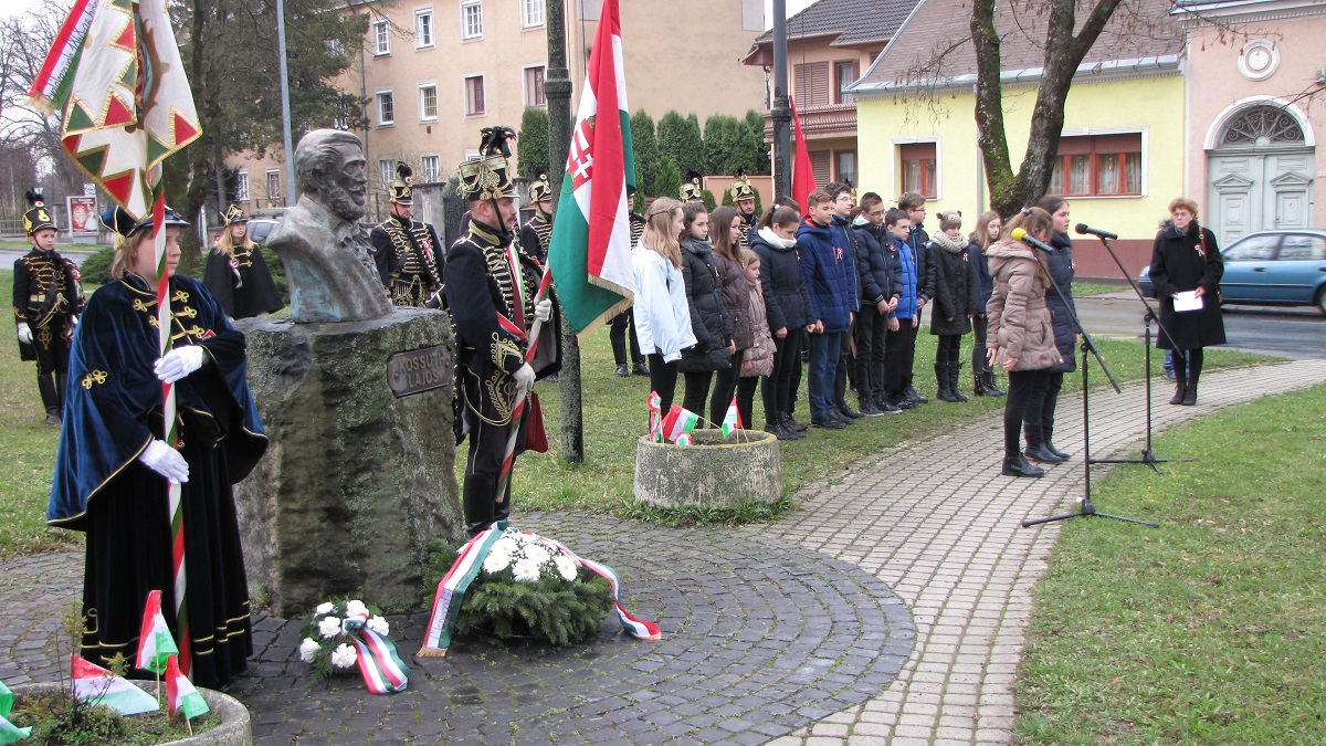 A városi ünnepségsorozat keretében hagyományosan iskolánk tanulói adják a koszorúzással egybekötött megemlékező műsort a Kossuth-szobornál. Idén iskolai programunk egy rövidített változatát adták elő a Jakab Lászlóné és Nagyné Horváth Edit tanárnők által felkészített hatodik osztályosok. Végül a központi temetőben a szabadságharc nagykanizsai honvédjeinek sírjára helyeztünk el egy-egy szál virágot s tűztünk mellé egy kis nemzeti zászlót.