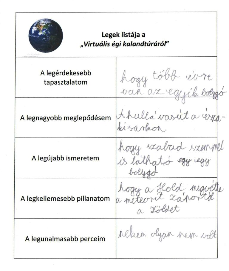 "Az égi kalandtúrán sokat tanultam a bolygókról és hogy épültek föl. Még az tetszett benne hogy 3D-s szemüveggel meg lehetett nézni az űrrakétát és más űrképződményt. Még mutattak olyan csillagképeket amit a görögök találtak." :)