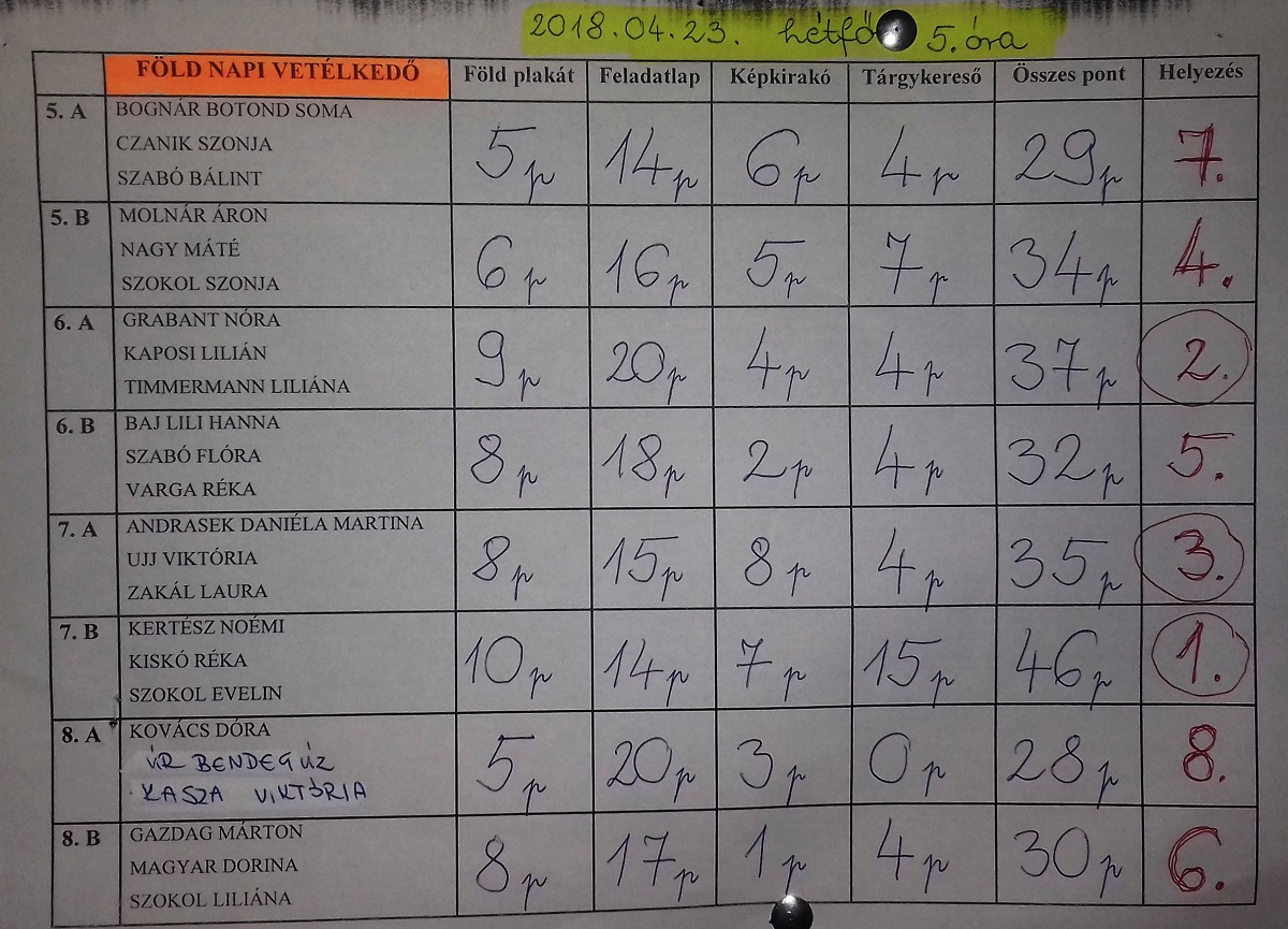 2018. április 23., Vetélkedő a Föld napja alkalmából A Föld napja alkalmából rendezett iskolai vetélkedőn az alábbi eredmények születtek: