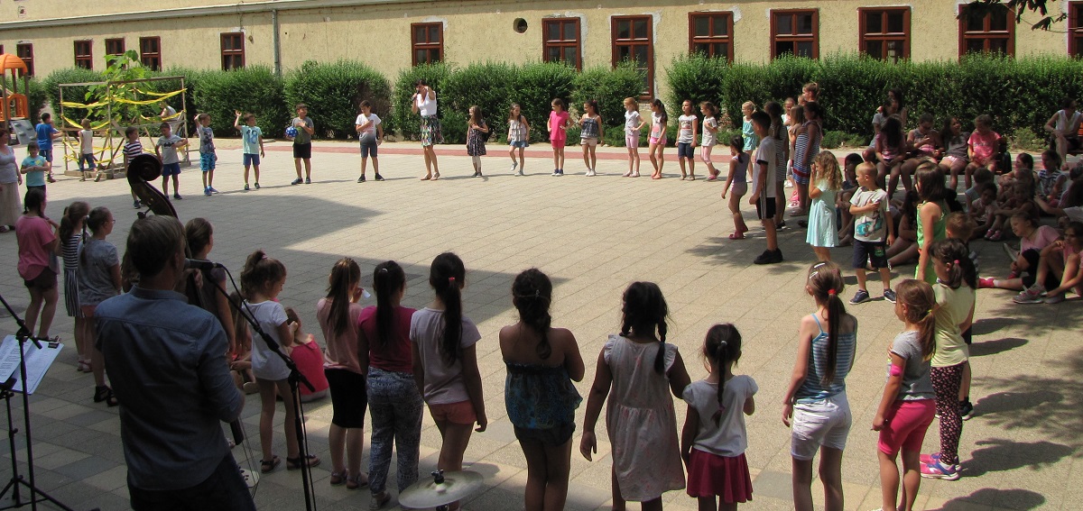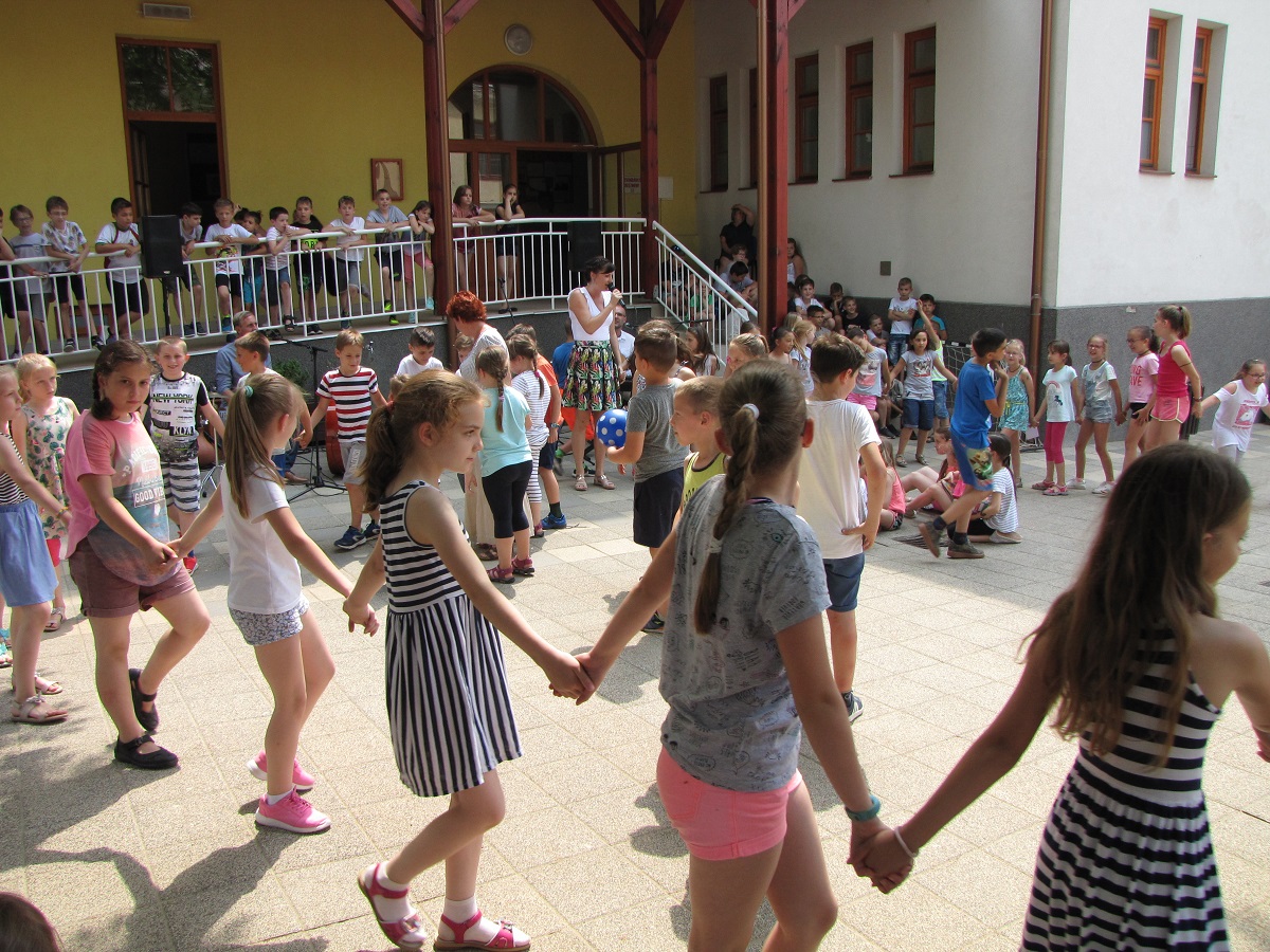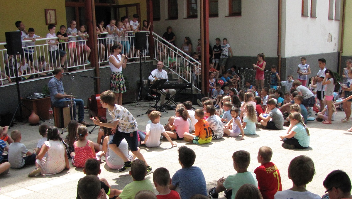 A 8.b osztályosoknak az előzőleg a hetedikesek által már megtekintett, végigizgult Cyber Cyrano tantermi színház előadás nyújtott élményt. Az alsósok a foci házibajnokság után az Aranykapu zenekar (vagy ITT, esetleg ITT) műsorát élvezhették.