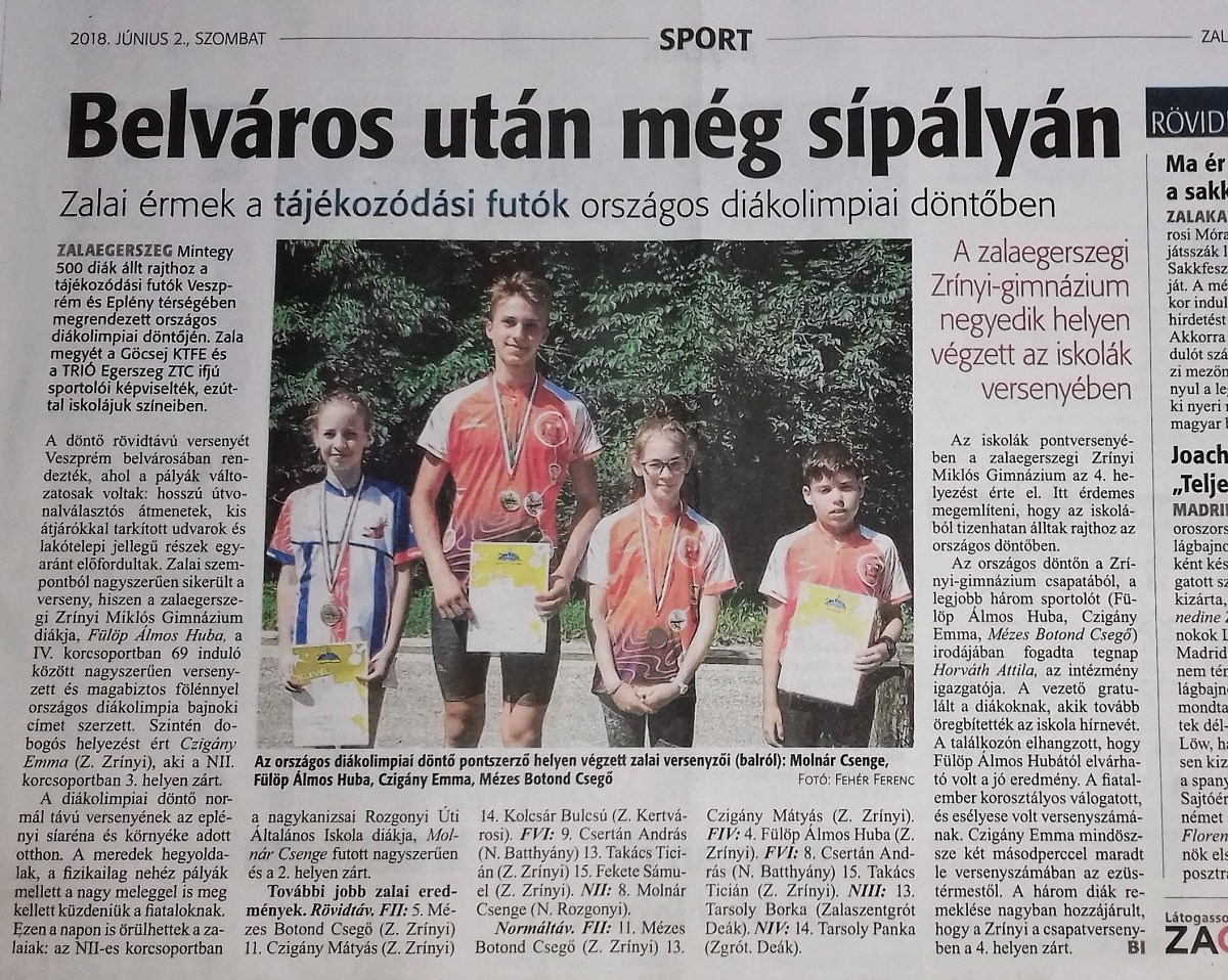 2018. május 26–27., Tájékozódási futó diákolimpia országos döntő, Veszprém, EplényII. kcs. lányok, normáltáv: 2. Molnár Csenge (4.b) II. kcs. lányok, rövidtáv: 8. Molnár Csenge Felkésztő: Molnárné Kovács Ivett