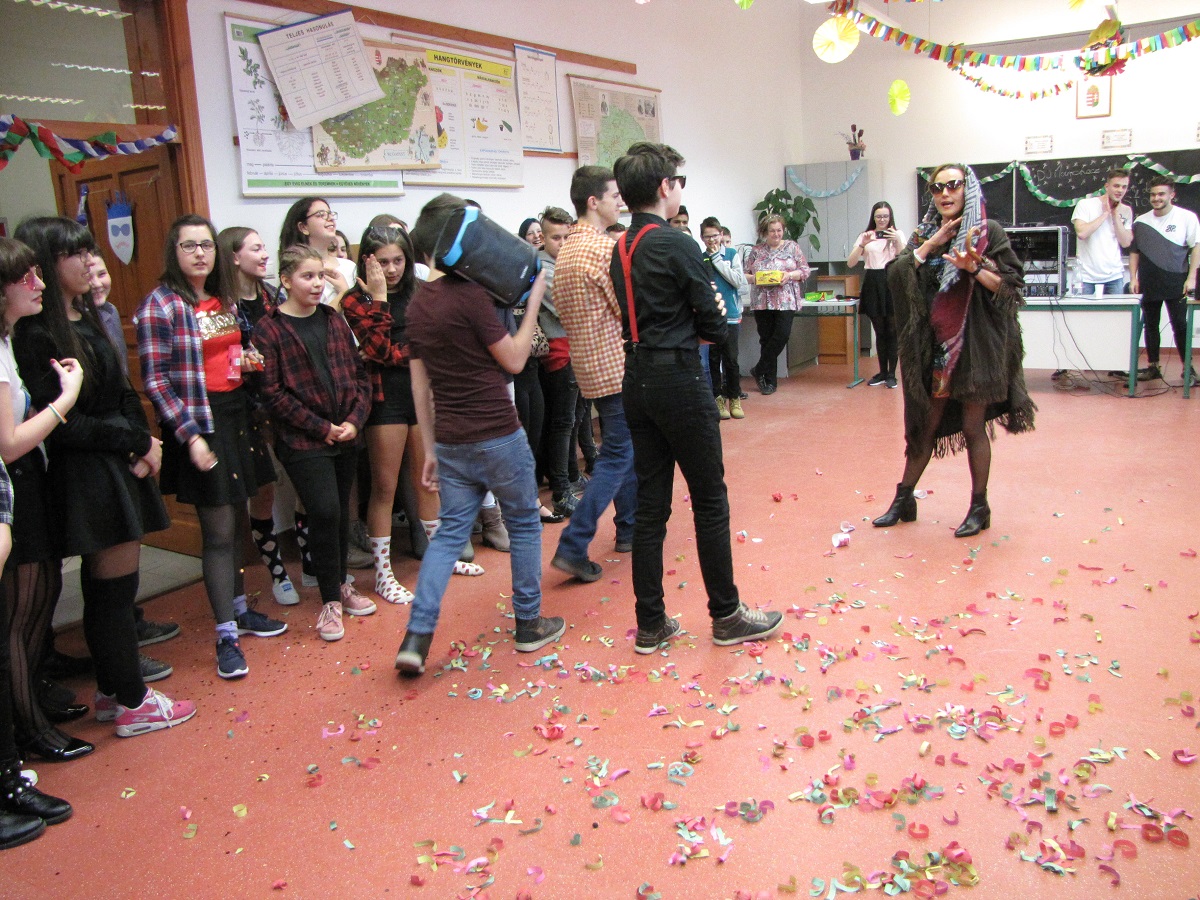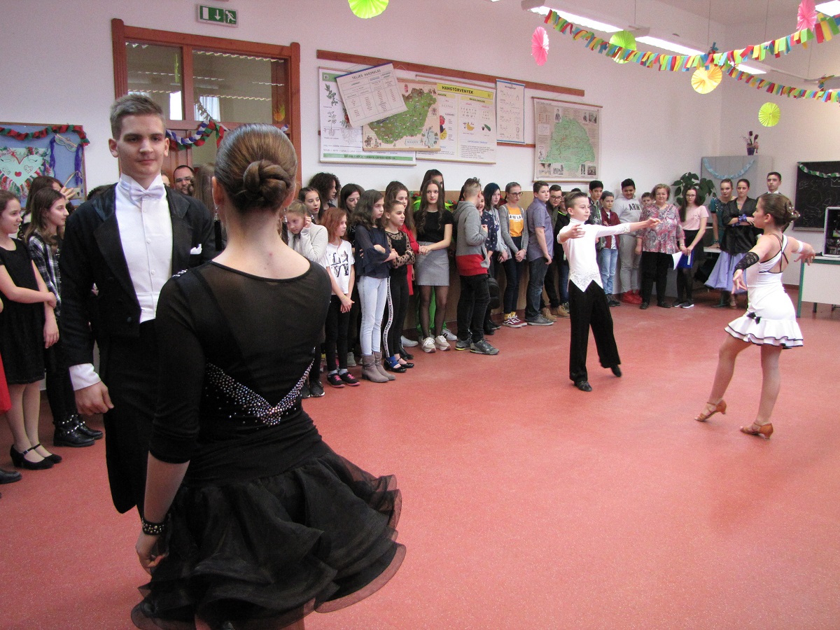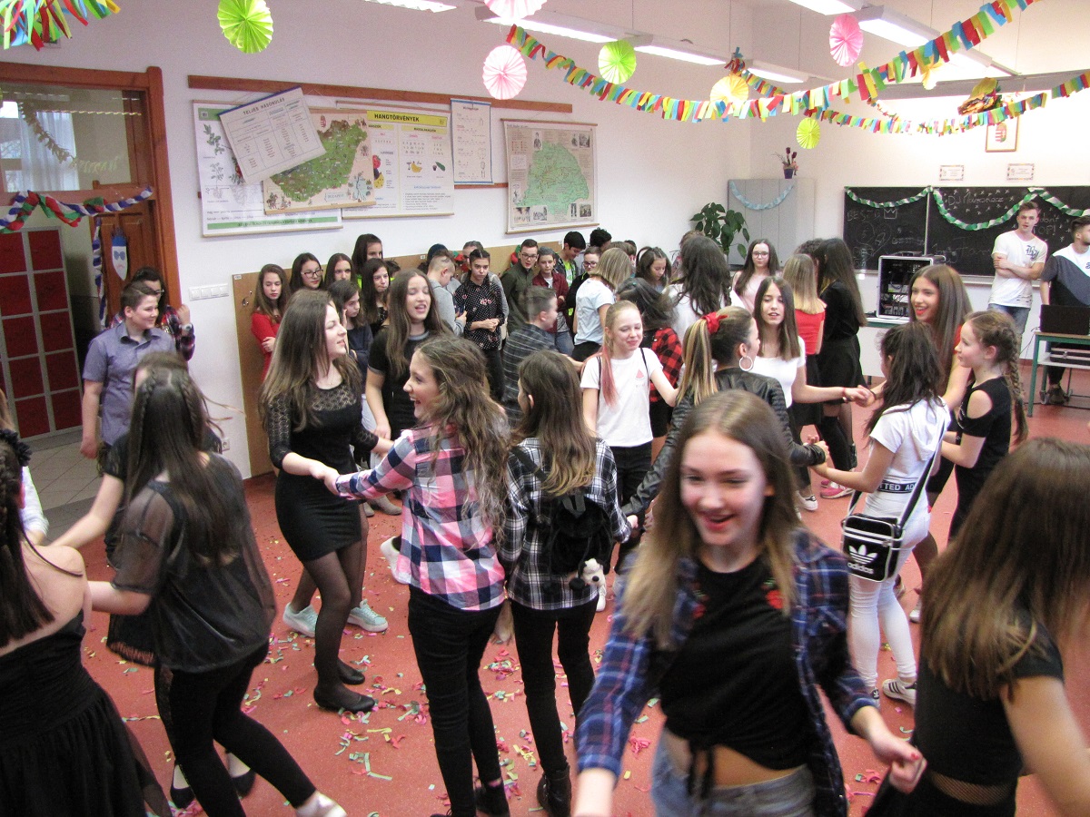 A felsős farsangot Mátyás Petra (8.b) diákelnök nyitotta meg, majd az Eraklin Táncklub táncosai mutatták be a nyitótánco(ka)t. Az 5., 6. és 8. osztályok táncos produkciói után kezdetét vette a karneváli mulatság.