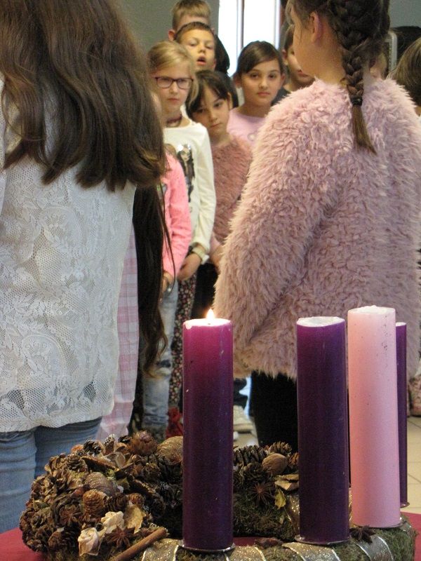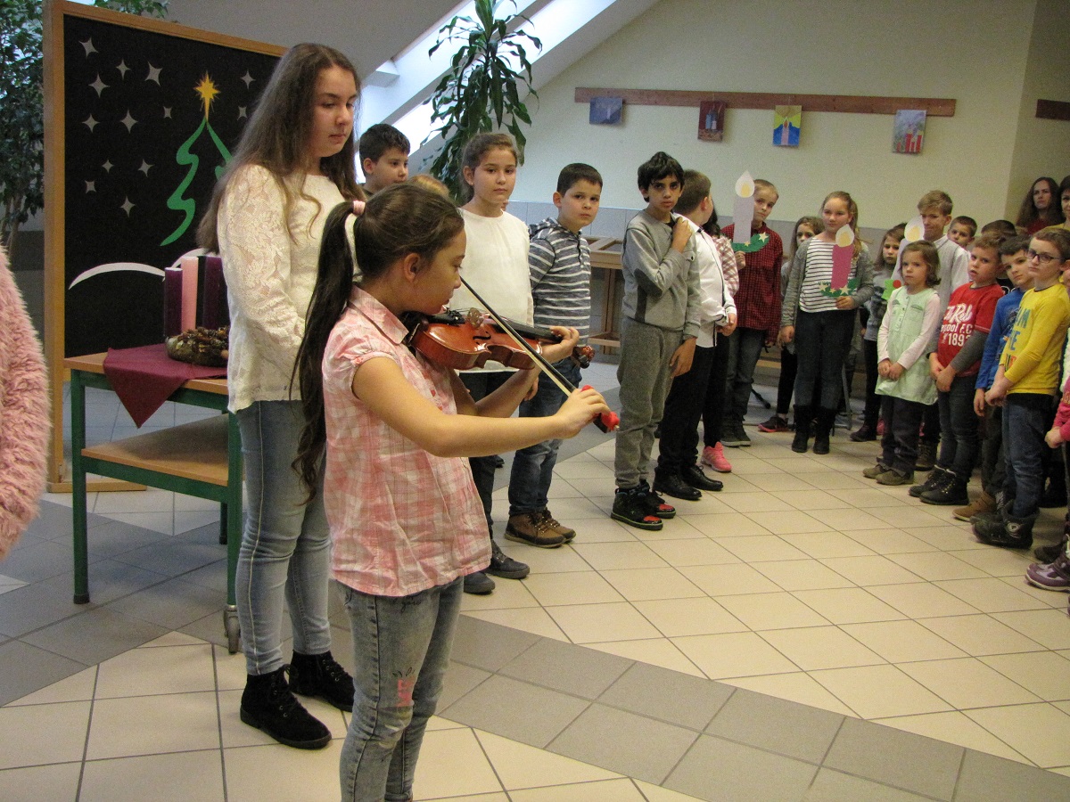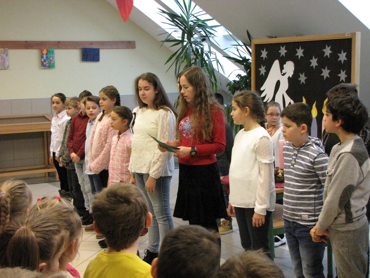 A várakozás heteit a 4.b osztályosok Bolláné Málek Mária és Borsosné Kalocsai Judit tanítónők által betanított műsora nyitotta. A tárlókban Boncz Adrienn alkotásait csodálhatták meg az érdeklődők.