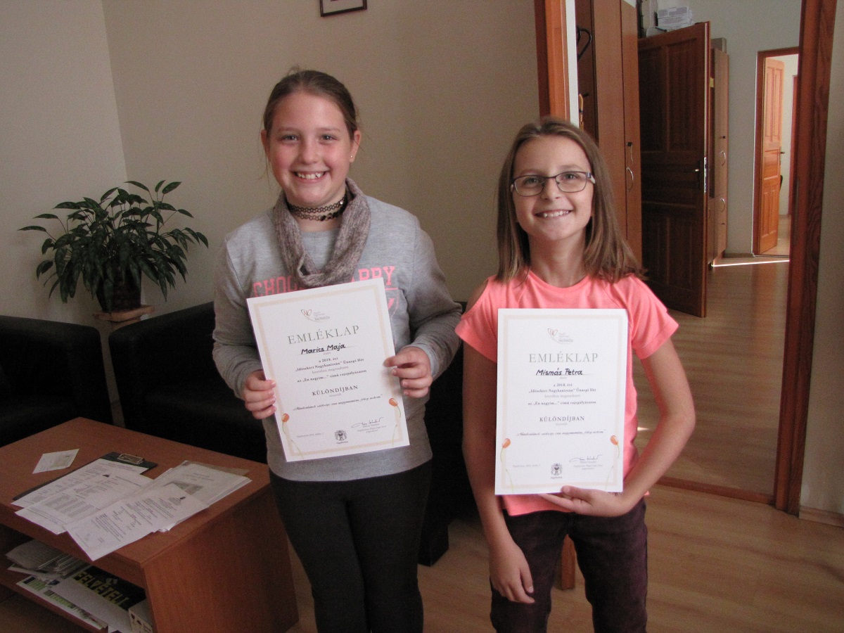 Két tanulónk nyert díjat az év első rajzpályázatán, amely "Az én nagyim" nevet viselte. Az 3.b osztályos Marics Maja és Mismás Petra egyaránt különdíjban részesült. Felkészítőjük Molnár Gabriella. A lányok a képen felcserélték okleveleiket!