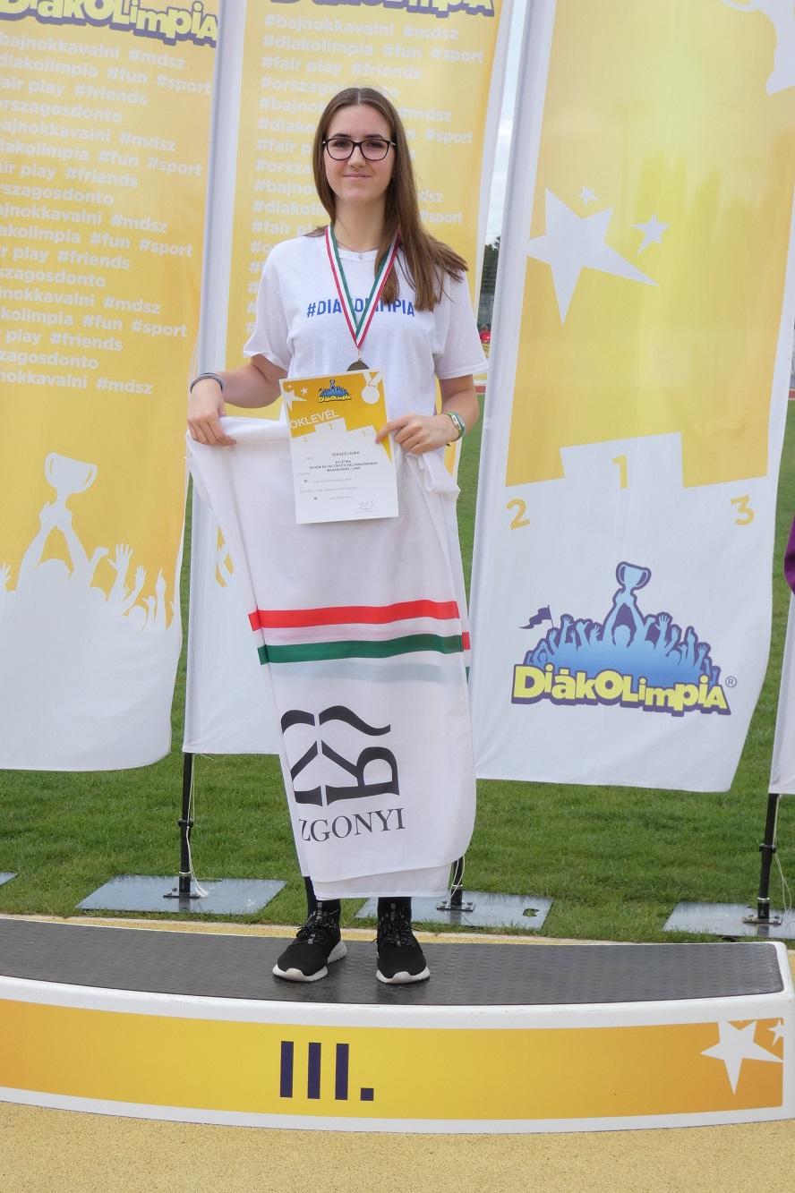 Május 25-én, Győrben került sor az atlétika diákolimpia e tanévi IV. korcsoportos egyéni országos döntőire. Golecz Laura, 8.a osztályos tanulónk a 7. legjobb eredménnyel kvalifikálta magát a versenyre, ahol kitűnő versenyzéssel, egyéni legjobbját megjavítva a dobogó harmadik fokára állhatott. Edzője Jeszenői Csaba.
