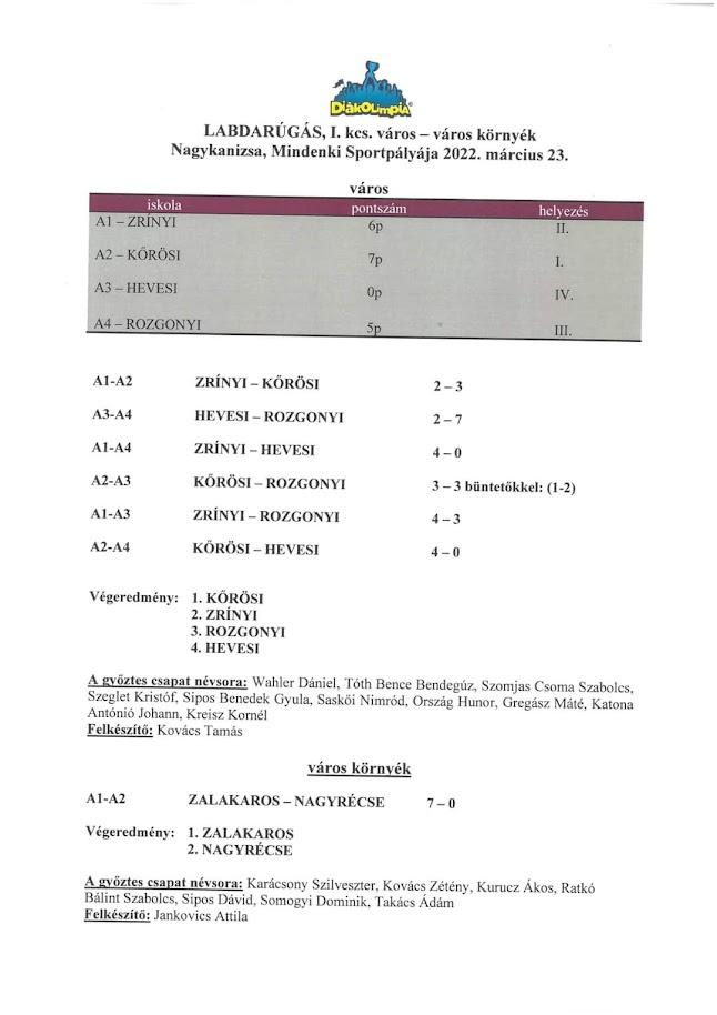 A Hevesi ellen magabiztosan győzött a rozgonyis gárda (7:2), majd a Kőrösi iskola együttesével döntetlent értünk el a rendes játékidőben (3:3). Büntetőrúgásokkal sikerült nyerni, így az utolsó összecsapás eredménye határozta meg a végső sorrendet. Sajnos az őszi mérkőzéshez hasonlóan egy góllal alulmaradtunk a Zrínyi iskolával szemben (4:3), így a „körbeveréseknek köszönhetően” 3. helyen végeztünk a tornán.