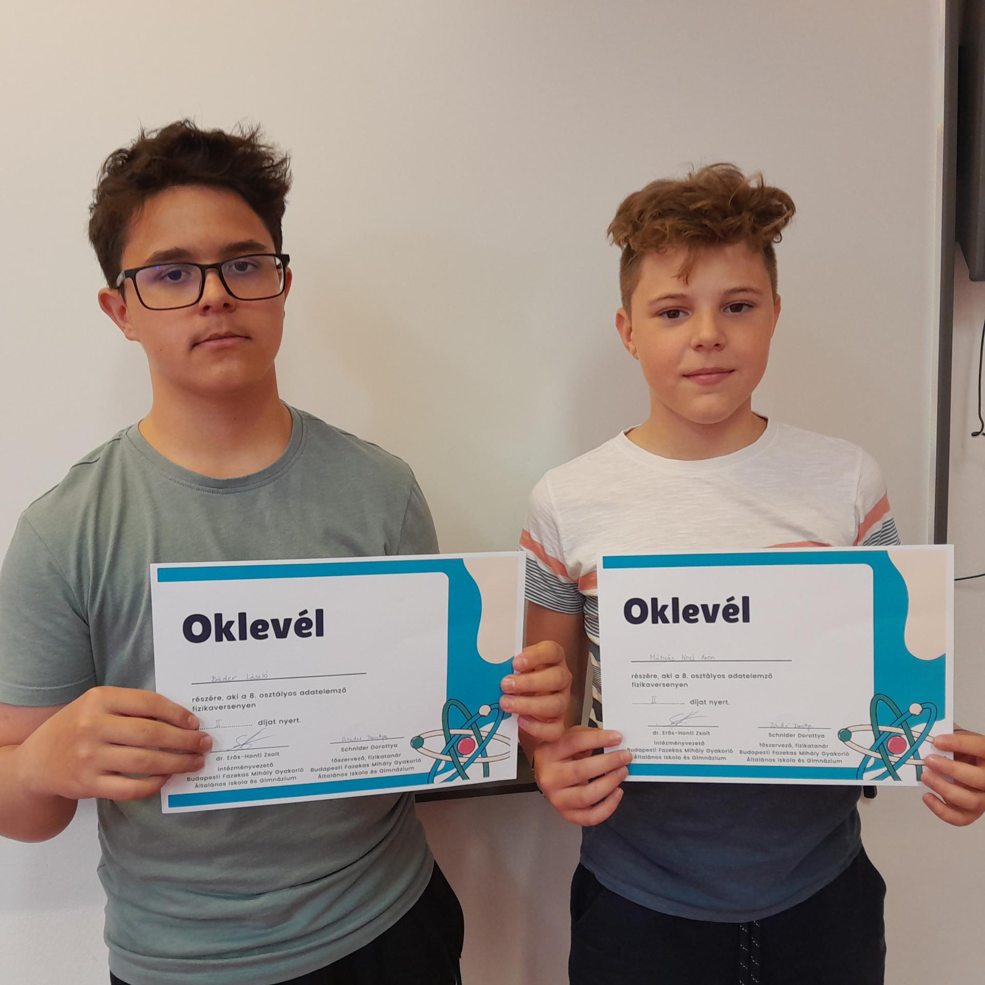 Tanulóink az országos mezőnyben kimagasló eredményt értek el az általános iskolai kategóriában: Báder László András (8.b) a 3. helyen, Mátyás Noel Áron (8.b) a 4. helyen végzett. Mindketten II. díjasok lettek.