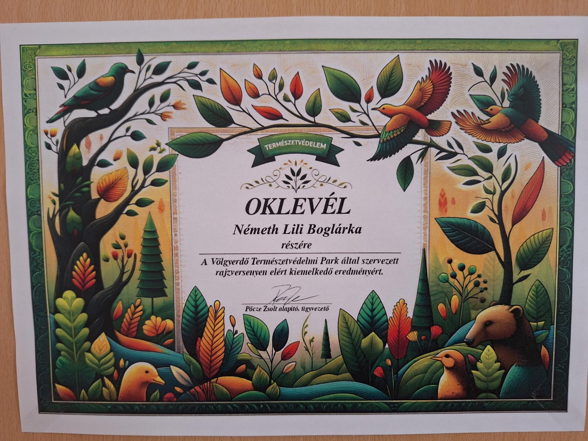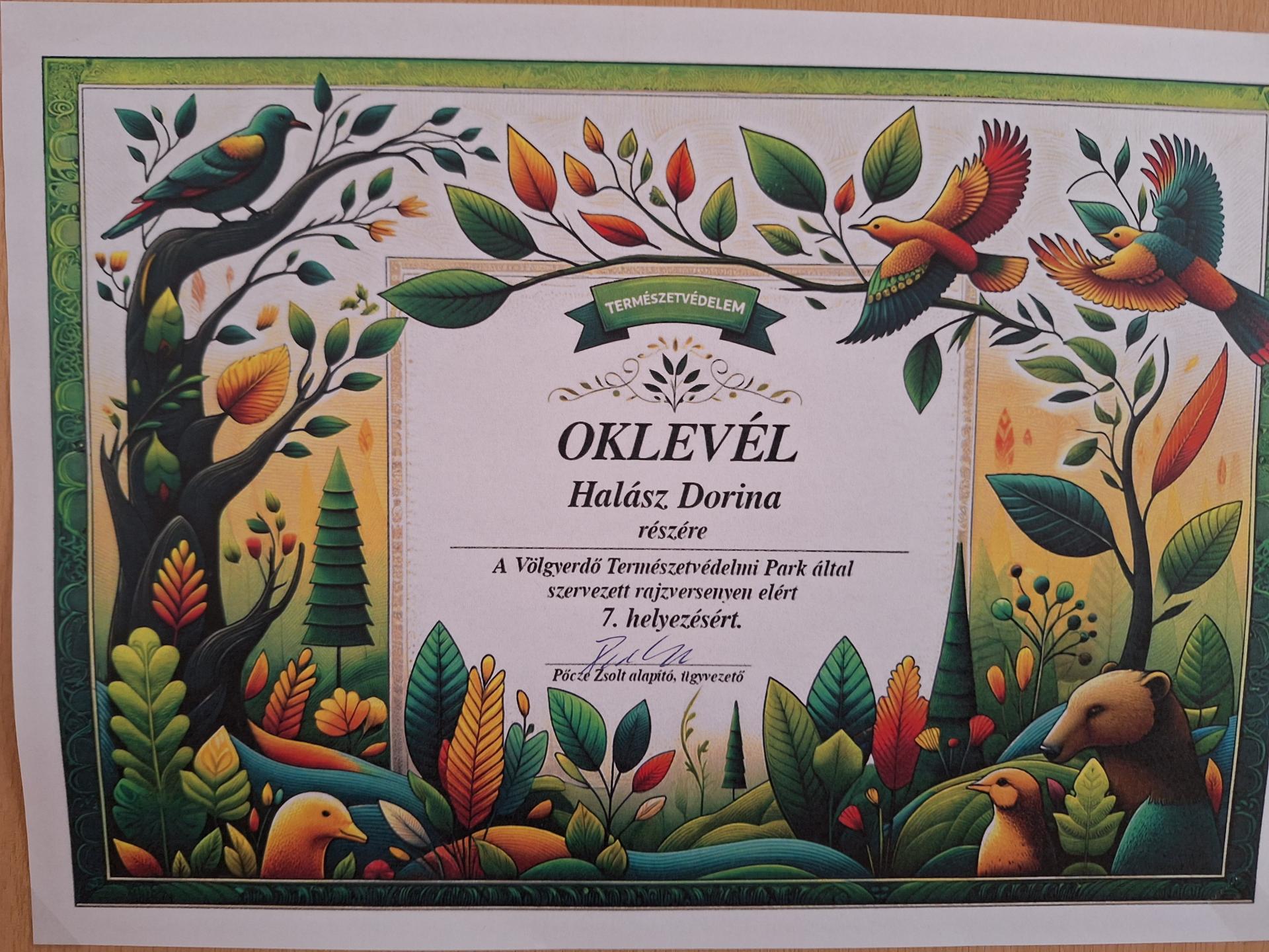 A Völgyerdő Természetvédelmi Park által szervezett rajzversenyen szép eredményeket gyűjtöttek be tanulóink: Németh Lili Boglárka, Zsován Zsófia, Halász Dorina diákok (mindannyian 1.b osztályos tanulók). Felkészítőjük: Németh Nóra.